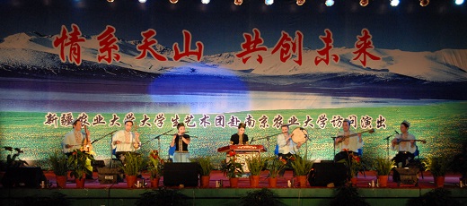 5月19日晚,南京农业大学文化广场宾朋云集,流光溢彩。七点整,一场由我校大学生艺术团特地编排的富有新疆民族特色的文艺节目在文化广场与南农学子同台演出。南京农业大学校领导管恒禄、郑小波、花亚纯、陈利根和新我校党委书记李宝城、副书记张杰与近万师生一起观看了演出。