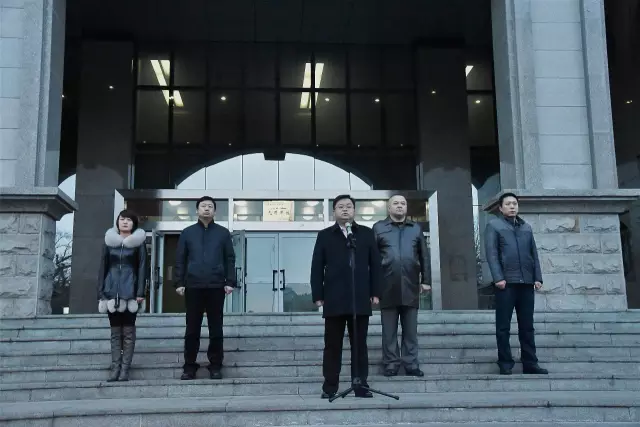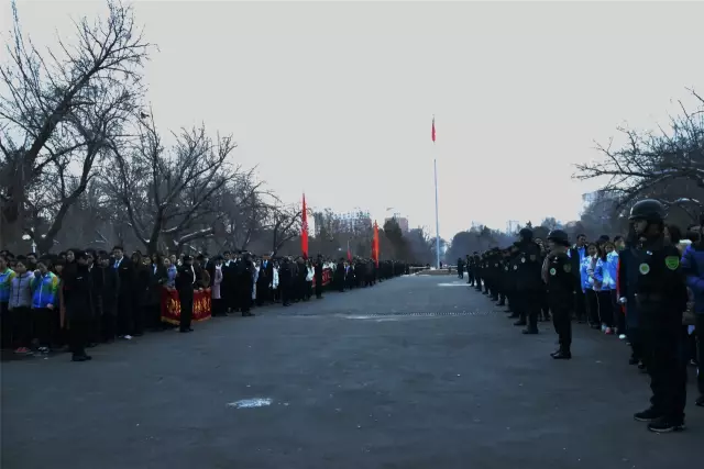 在寒冷的晨风中,国旗伴随着国歌缓缓升起。在场师生们高唱国歌,歌声嘹亮。
