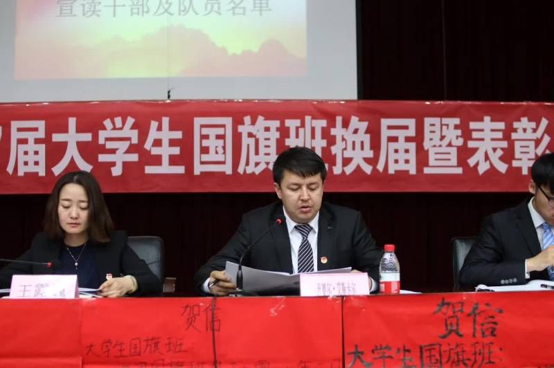 开赛尔·艾斯卡尔老师宣读《关于授予新疆农业大学第二十八届大学生国旗班干部任命的决定》,任命房庄为第二十八届国旗班班长,贾天卓为第二十八届国旗班副班长,丁小雨为第二十八届国旗班团支书,台上是“新生”,台下是“过去”,过去的辉煌与新生的力量,是新疆农业大学第二十七届国旗班对第二十八届的殷切希望。